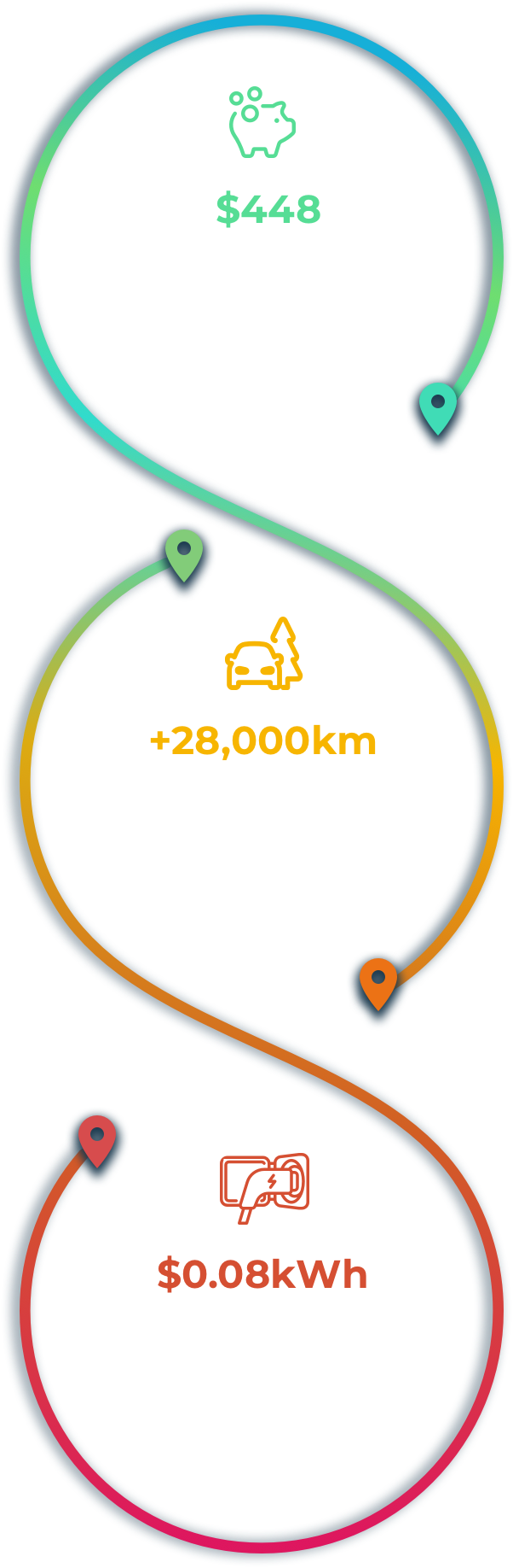 *This is based on the amount saved per year for a customer on The EV Plan compared to The One Plan in the United Energy distribution network ($448) divided by the EV Plan charging rate ($0.08/kWh) divided by the typical charging required to go 1km (i.e. 20kWh / 100km = 0.2 kWh/km source: Drive). The equation therefore is ($448 / $0.08) = 5600kWh of additional usage per annum. ($5600 / 0.2kWh = 2800km). Actual savings and cost of distance travelled will vary depend on charger, vehicle, household electricity supply, time of day charged and other environmental factors.