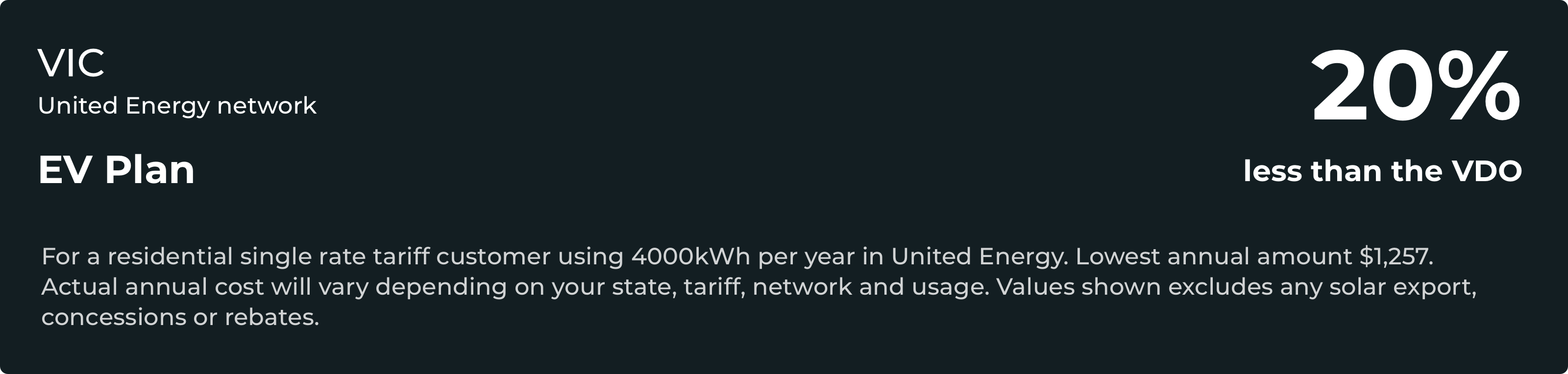 ^This is based on a total of 13800 km driven per year (source AAA), where every 100km = 0.2kWh of electric charging (source: Drive) totalling 2760kWh. Then using a comparison between The One Plan single rate charges ($0.25267/kWh) vs The EV Plan charging rate ($0.08/kWh) in the United distribution network, Victoria. Actual savings and cost of distance travelled will vary depending on charger, vehicle, household electricity supply and other environmental factors.