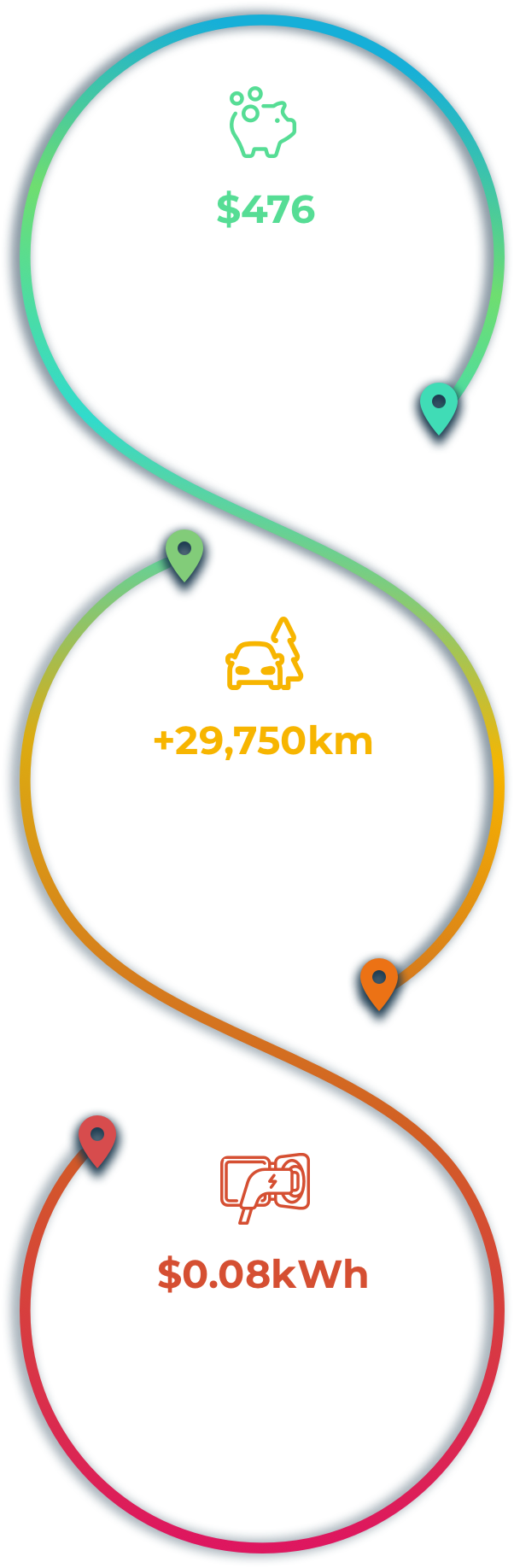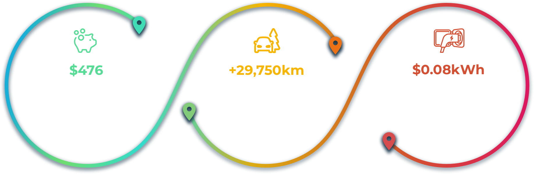 *This is based on the amount saved per year for a customer on The EV Plan compared to The One Plan in the United Energy distribution network ($476) divided by the EV Plan charging rate ($0.08/kWh) divided by the typical charging required to go 1km (i.e. 20kWh / 100km = 0.2 kWh/km source: Drive). The equation therefore is ($476 / $0.08) = 5950kWh of additional usage per annum. An assumption has been made on the amount of charging split between the EV Charging rate and the Super Off-Peak rate based on OVO's current customers. ($5950 / 0.2kWh = 29750km). Actual savings and cost of distance travelled will vary depend on charger, vehicle, household electricity supply, time of day charged and other environmental factors.