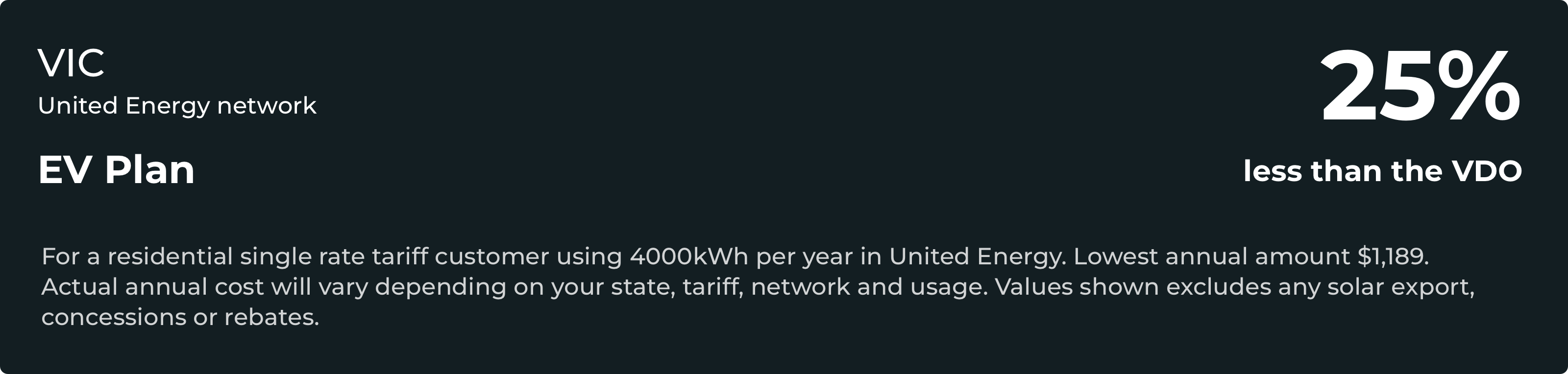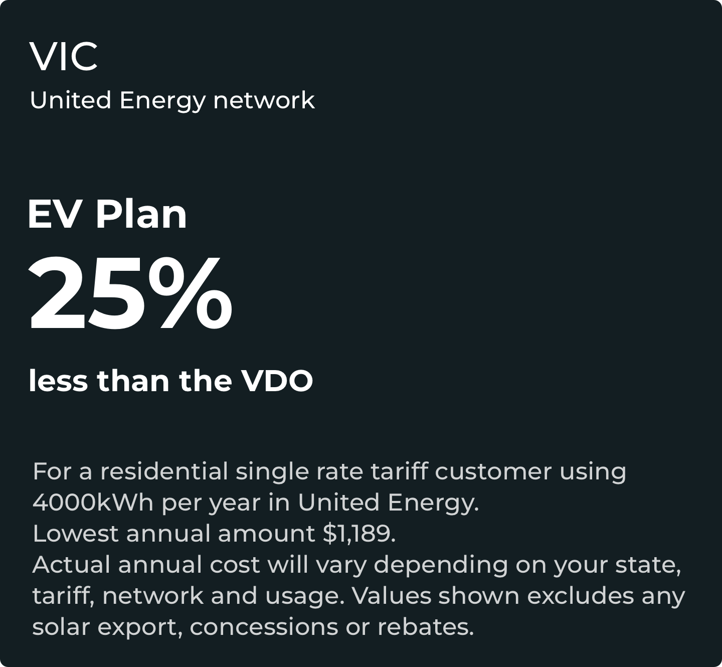^This is based on a total of 13800 km driven per year (source AAA), where every 100km = 20kWh of electric charging (source: Drive) totalling 2760kWh. Then using a comparison between The One Plan single rate charges ($0.23507/kWh) vs The EV Plan charging rate ($0.08/kWh) in the United distribution network, Victoria. Actual savings and cost of distance travelled will vary depending on charger, vehicle, household electricity supply and other environmental factors.
