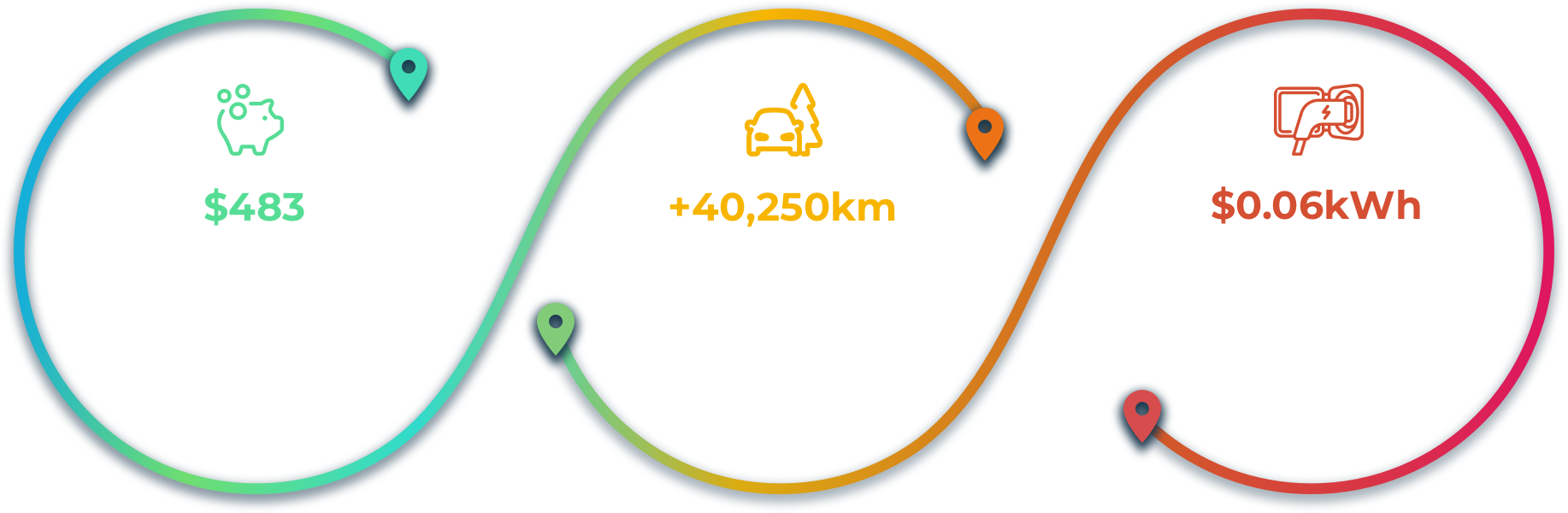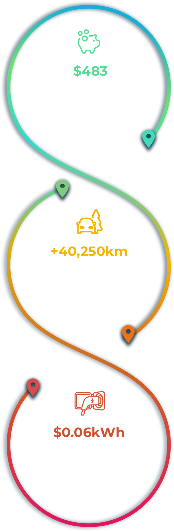 *This is based on the amount saved per year for a customer on The EV Plan compared to The One Plan in the United Energy distribution network ($483) divided by the EV Plan charging rate ($0.06/kWh) divided by the typical charging required to go 1km (i.e. 20kWh / 100km = 0.2 kWh/km source: Drive). The equation therefore is ($483 / $0.06) = 8050kWh of additional usage per annum. ($8050 / 0.2kWh = 40250km). Actual savings and cost of distance travelled will vary depend on charger, vehicle, household electricity supply, time of day charged and other environmental factors.